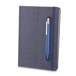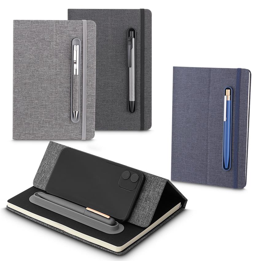 Caderno produzido com capa em tecido RPET e suporte para caneta na capa,