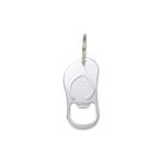 Chaveiro abridor metálico em formato de chinelo.