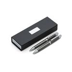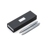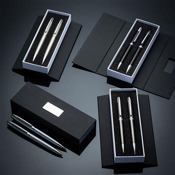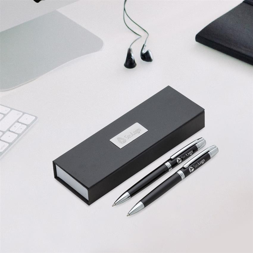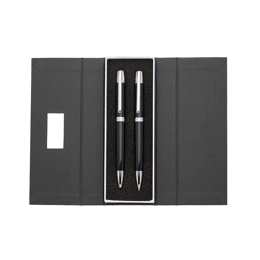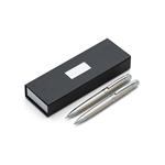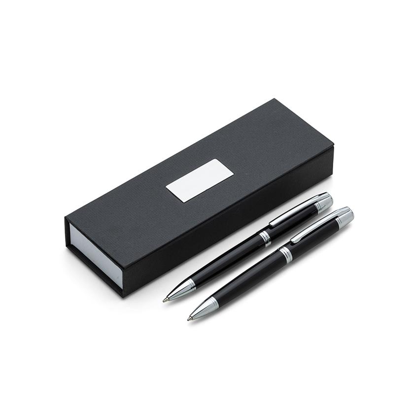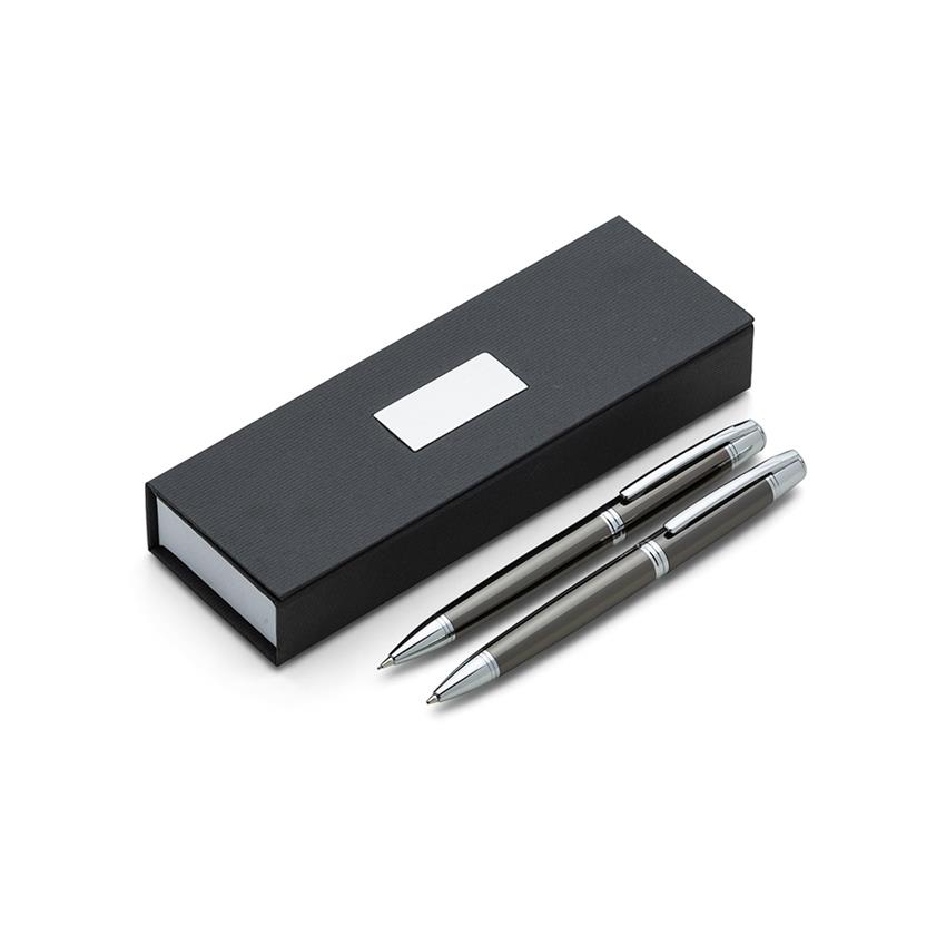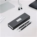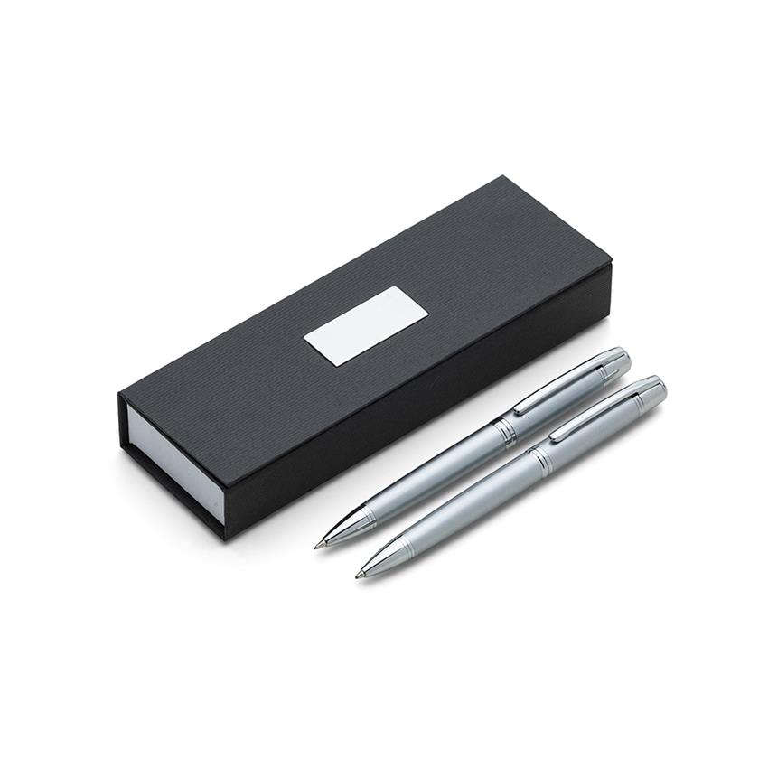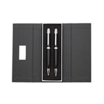 Conjunto caneta e lapiseira em estojo de cartonagem com placa central para personalização.