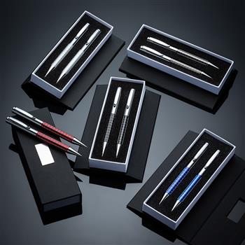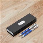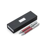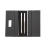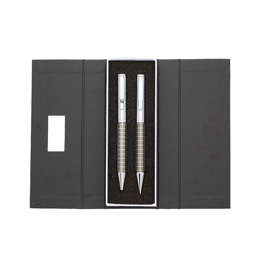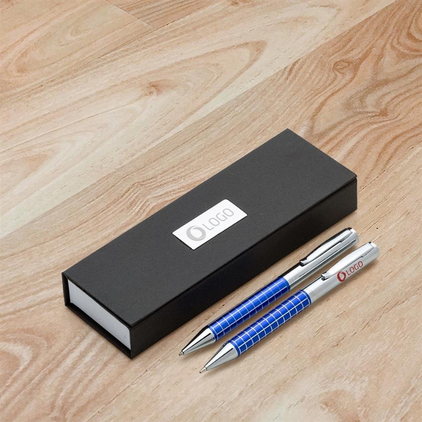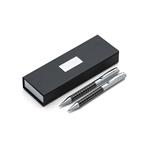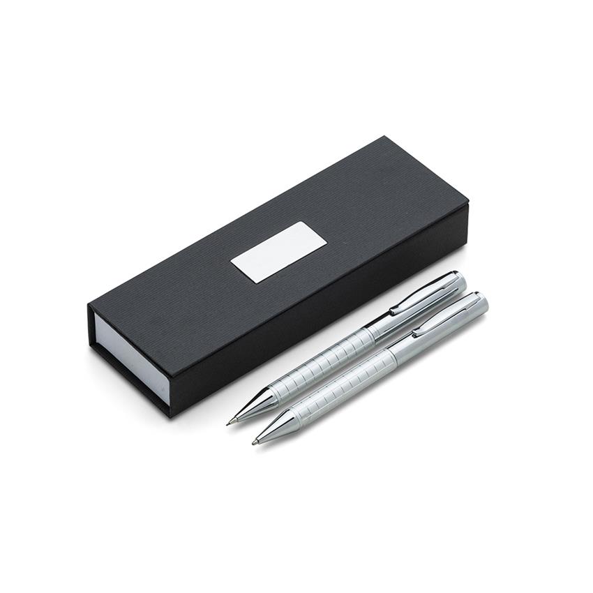 Kit caneta e lapiseira de metal em estojo papelão com placa de metal(parte interna do estojo revestida com espuma).