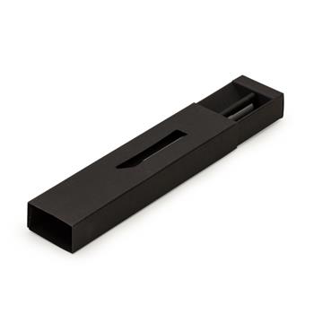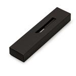 Estojo de papel para uma caneta, possui um visor vazado na capa.