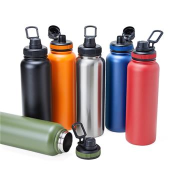 Garrafa térmica feita em inox com parede dupla, capacidade de 1,2 litros.