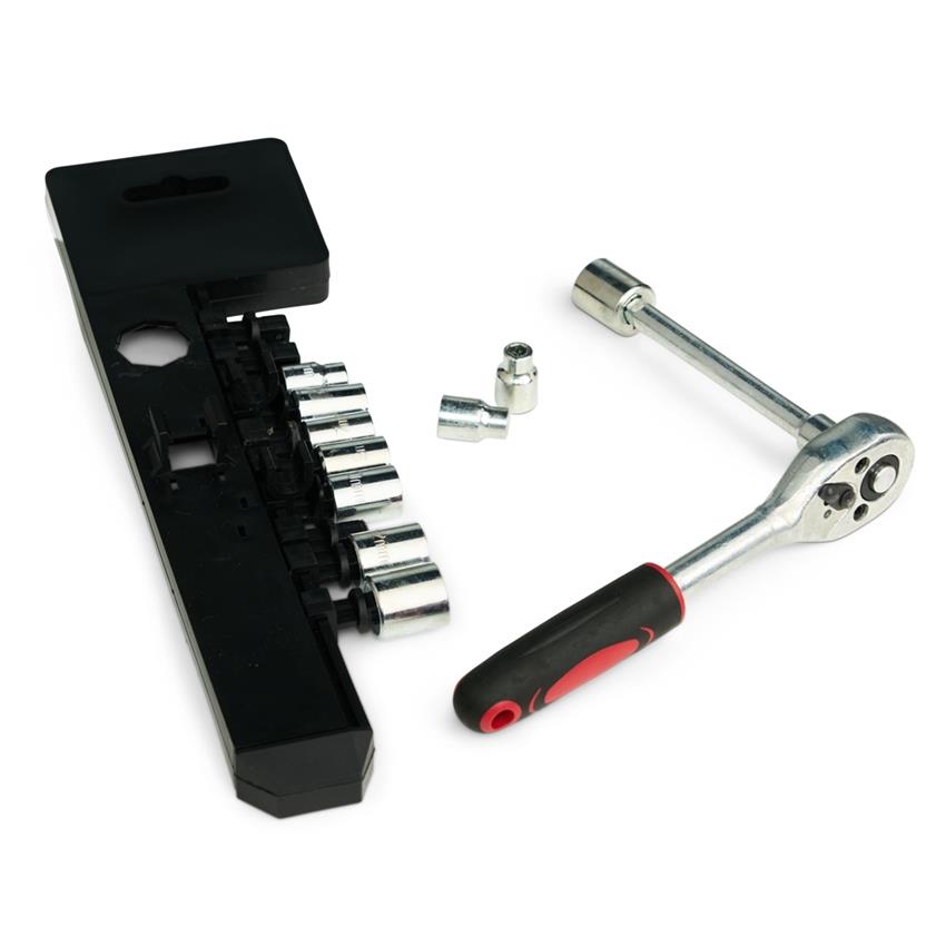 1 chave catraca, 1 chave extensora e 10 soquetes.